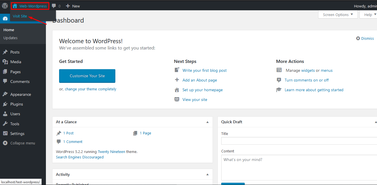 Bila ingin melihat website kamu, cukup arahkan cursor mouse ke bagian pojok kiri atas judul web kamu dan klik link “Visit site“.