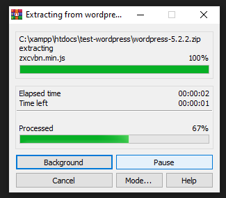 2. Setelah download file Wordpress nya dan install XAMPP, bisa langsung masuk ke folder XAMPP, lalu cari folder htdocs dan di sana buat folder lagi untuk menaruh folder dan file-file hasil extract dari Zip Wordpress, nama foldernya bebas dan saya disini memberikan nama “test-wordpress”. Lalu extract file Zip Wordpress nya.