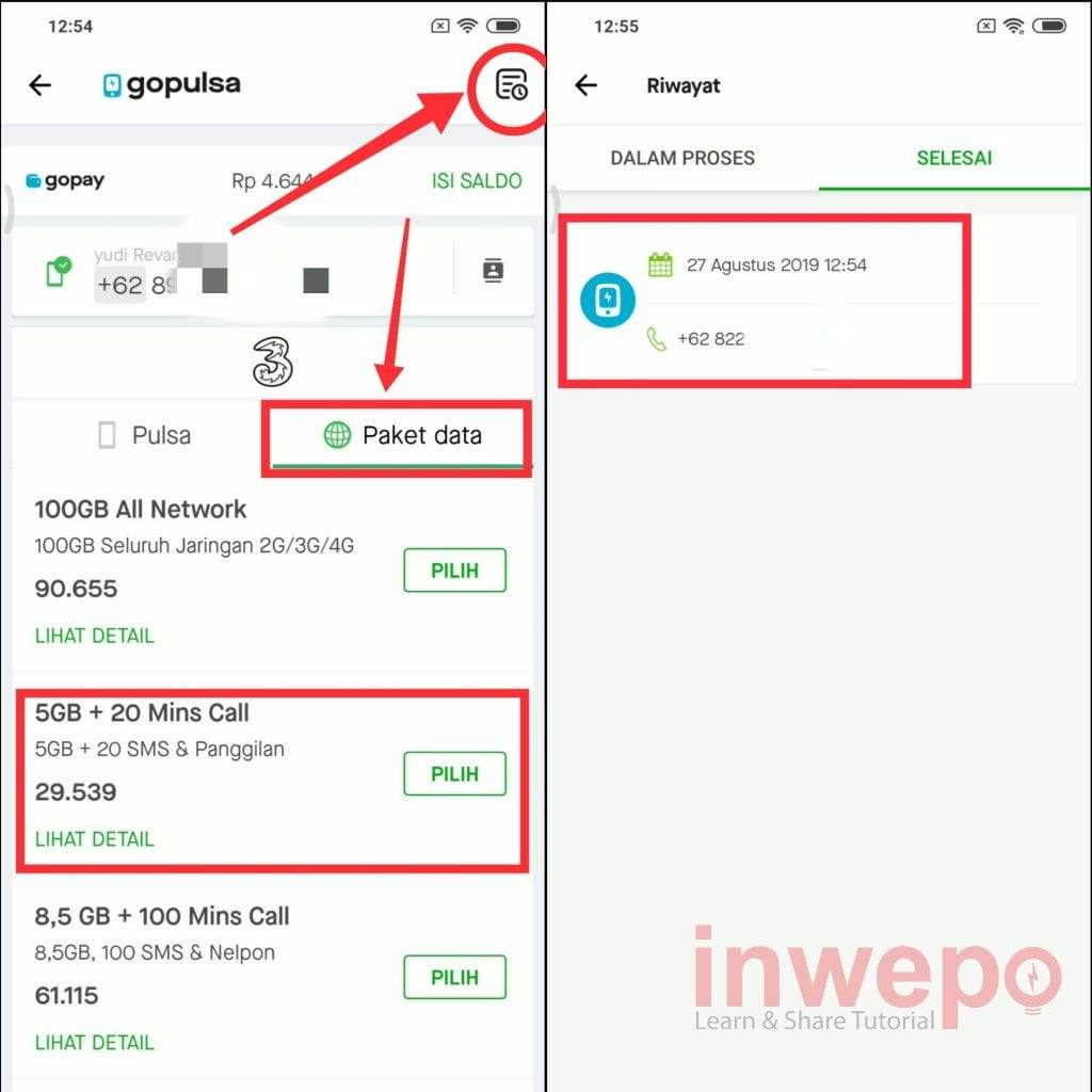 5. Untuk pengisian paket data sama hanya saja pilih menu Paket Data kemudian pilih paket yang ingin kamu beli. Untuk melihat riwayat transaksi tap menu yang berada di bagian pojok kanan atas.