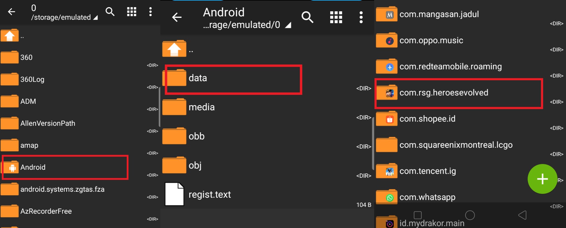 2. Cari folder game-nya di memori internal Android – data – com.rsg.heroesevolved.