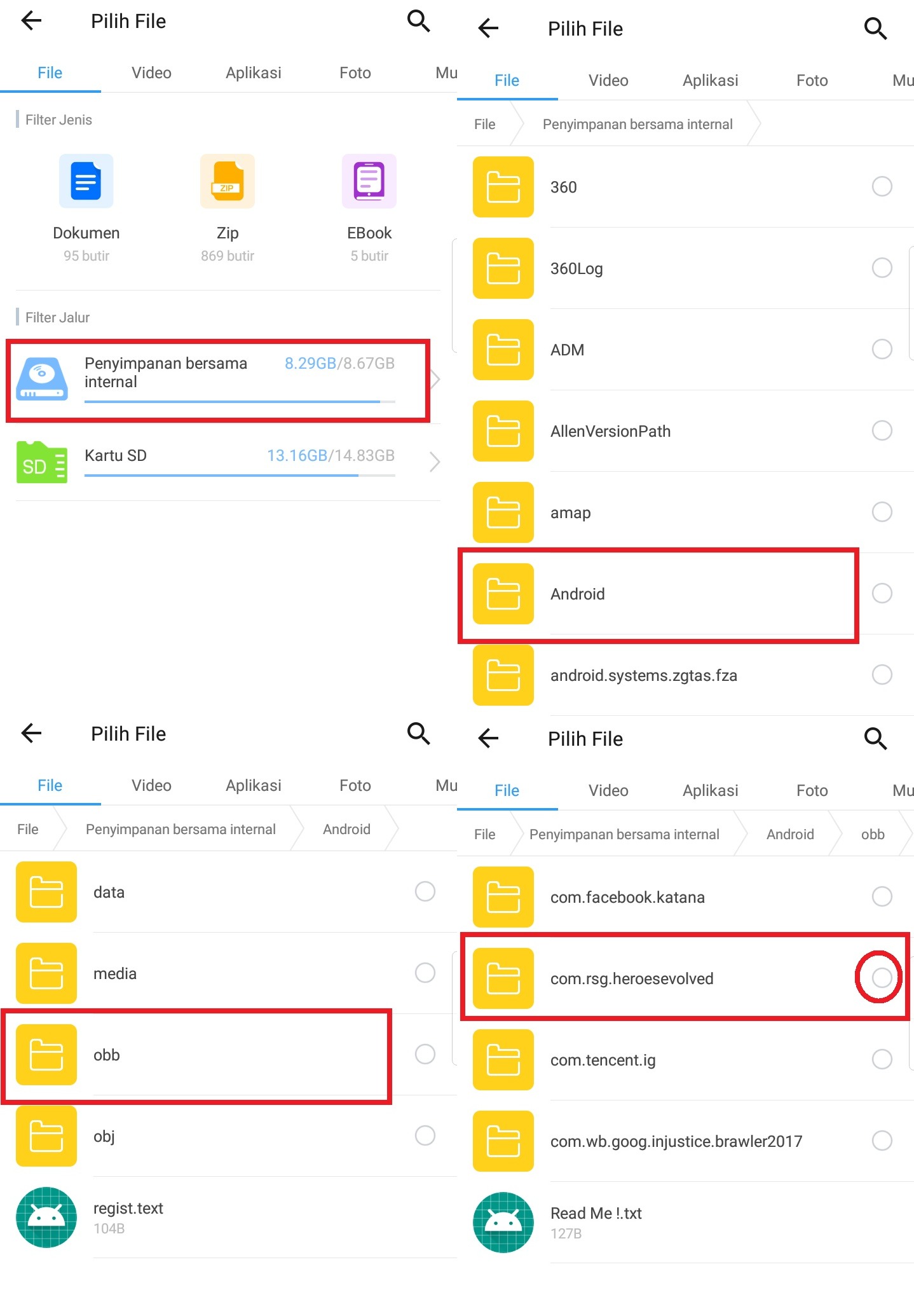 3. Selanjutnya pindah ke internal memori, pilih Penyimpanan bersama internal – Android – obb – pilih folder obb game-nya “com.rsg.heroesevolved”.