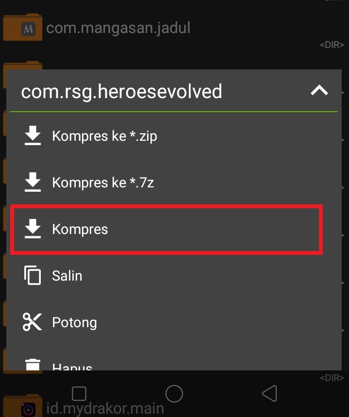 3. Tekan sambil tahan folder “com.rsg.heroesevolved” tersebut, lalu pilih Kompres.