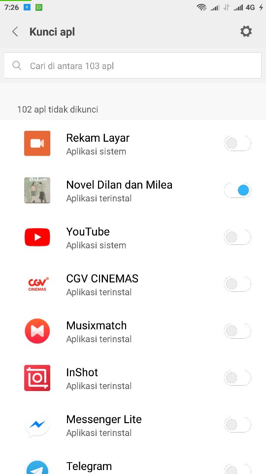 5. Jika sudah, kamu akan dialihkan ke menu untuk memilih aplikasi-aplikasi yang kamu inginkan untuk dikunci, cara memilih aplikasi yang ingin dikunci adalah menggeser tombol yanga ada di sebeleh kanan nama aplikasi.