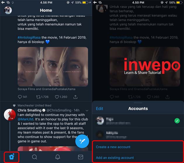 1. Buka aplikasi Twitter di iPhone – Ketuk dan tahan ikon rumah di kiri bawah – ketuk Create a new account untuk membuat akun baru – ketuk Add an existing account untuk login akun lainnya.