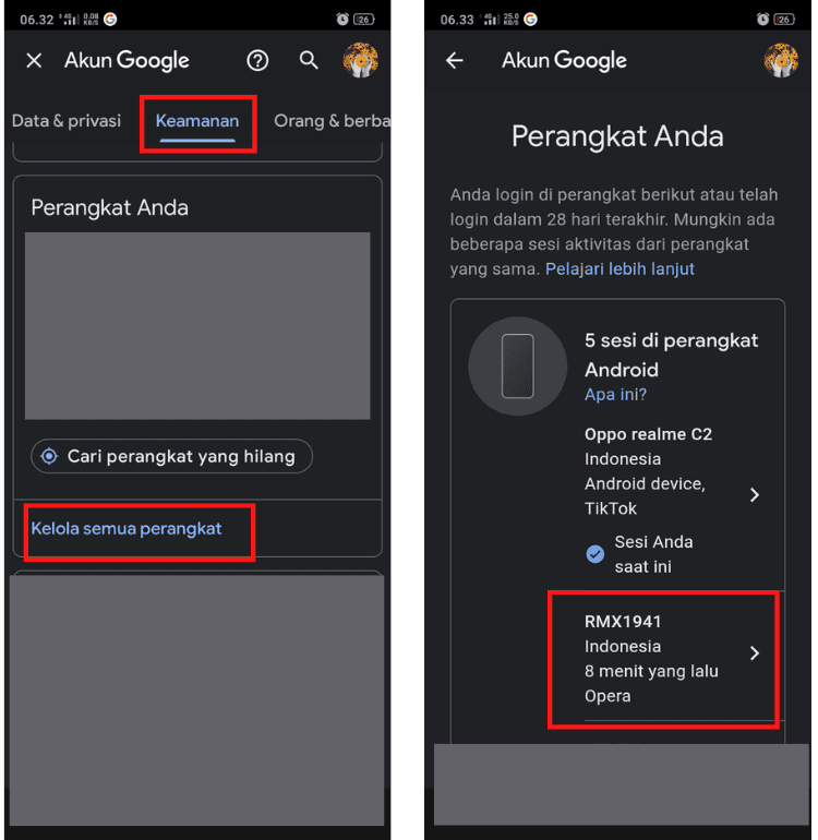2. Pada halaman pengaturan akun Google, cari dan pilih folder Keamanan. Scroll kebawah folder keamanan dan kemudian cari kolom Perangkat Anda. Pada kolom ini, tersimpan semua daftar browser maupun aplikasi yang menggunakan akun Google kamu tersebut. Tap link Kelola semua perangkat.