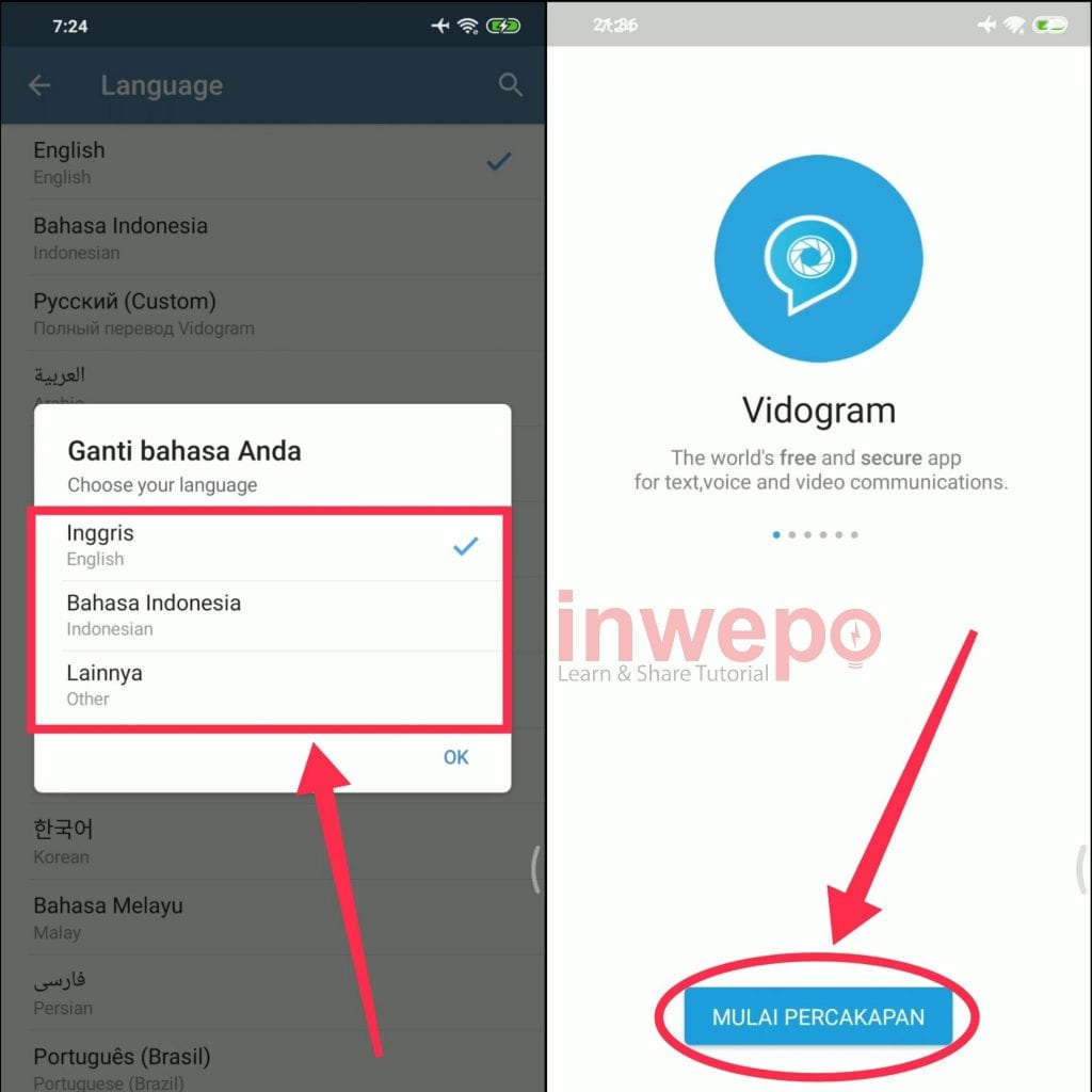 2. Buka aplikasi Vidogram kemudian pilih bahasa yang akan kamu gunakan lalu tap Mulai Percakapan.