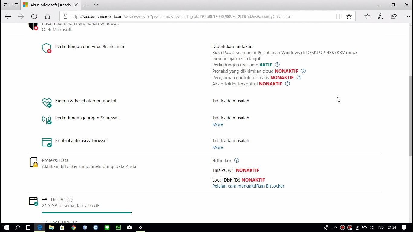 12. Disini akan ditampilkan informasi perangkat kamu tentang update Windows, keamanan Windows, proteksi data, dan penggunaan harddisk kamu saat ini.