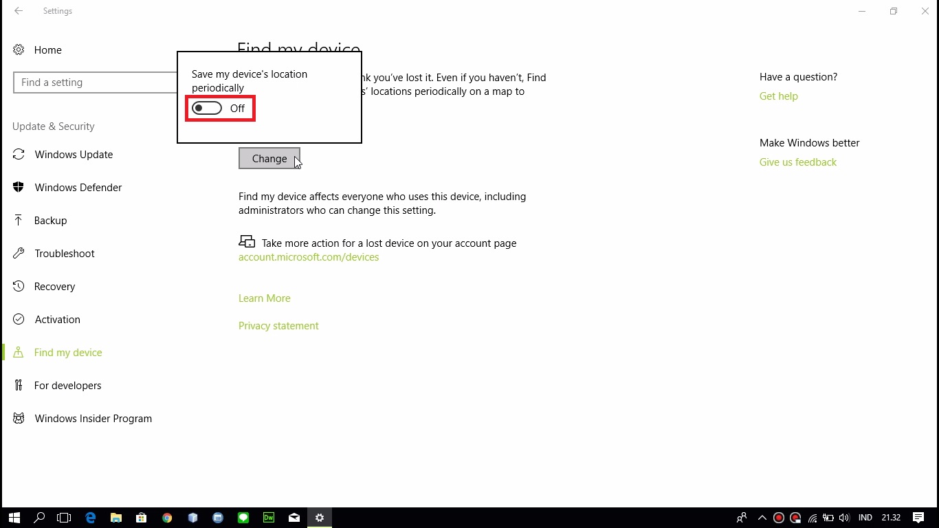 5. Saat pertama kali menggunakan fitur ini, fitur find my device akan berstatus off. Untuk menyalakannya klik tombol change.