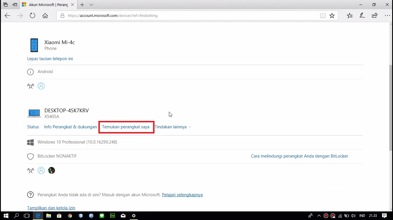 9. Saat sudah login, kamu akan ditampilkan daftar perangkat yang sudah kamu daftarkan dengan akun Microsoft ini. Klik link temukan perangkat saya di bagian laptop kamu.