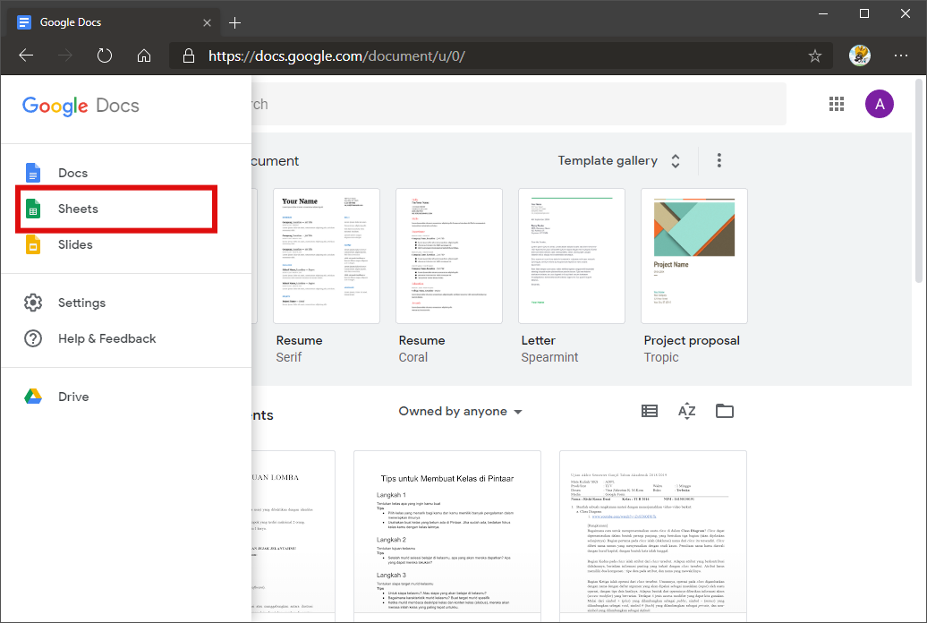 3. Setelah muncul opsi lanjutan mengenai halaman Google Docs, pilih opsi Sheets untuk berpindah menuju halaman Google Spreadsheet.