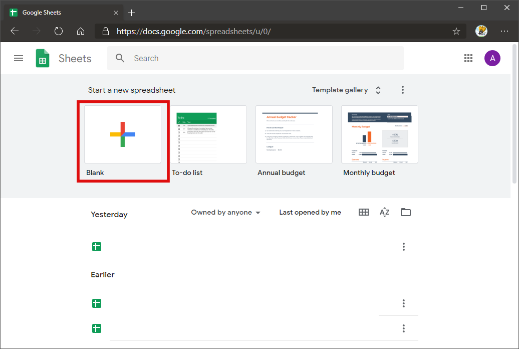 4. Pada halaman Google Spreadsheet, pilih opsi Blank (yang diwakili dengan logo plus warna-warni). Nantinya, kita akan diarahkan menuju halaman baru dari Sheets, dimana halaman ini akan kita gunakan sebagai media bulk translate.