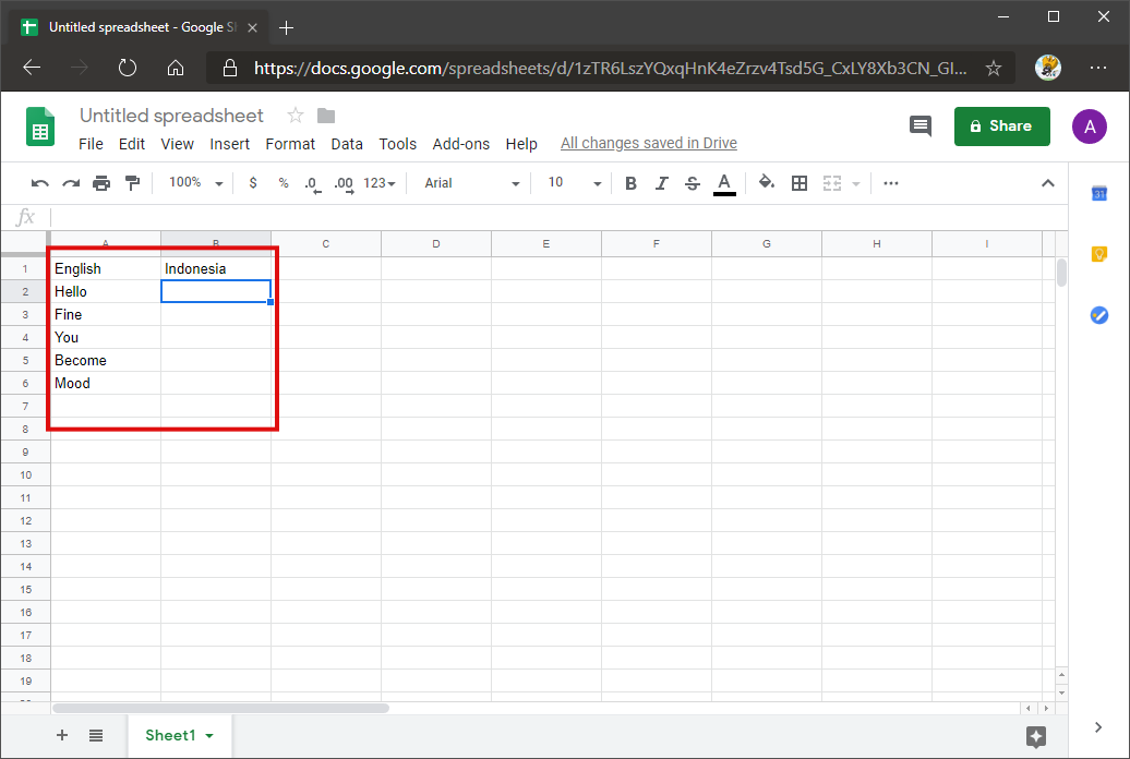 6. Pada bagian ujung (sesuaikan dengan posisi data yang diinginkan), beri header yang menandakan bahasa yang ingin kita terjemahkan (yang ditempatkan di sisi kiri) serta header dari hasil bahasa yang diterjemahkan (yang ditempatkan di sisi kanan). Lalu, pada sisi kiri, isikan informasi / kalimat / kata yang nantinya akan kita terjemahkan sesuai dengan bahasa yang diinginkan.