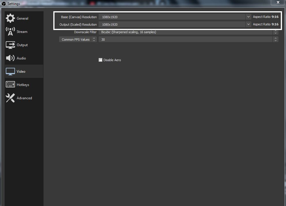 2. Setelah itu, kamu masuk ke OBS ke menu File – Settings – Video, ubah dua bagian resolusi di atas menjadi 1080×1920 agar menjadi mode portrait.
