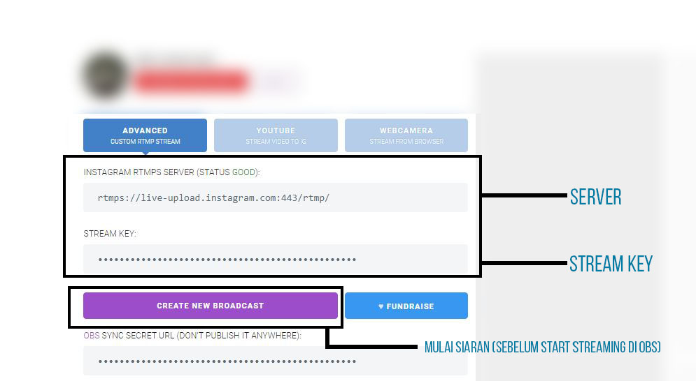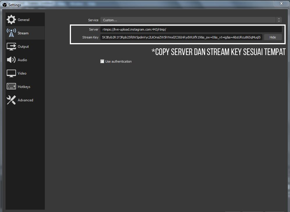 7. Ubah server dan stream key sesuai yang tertera di situs instafeed.me