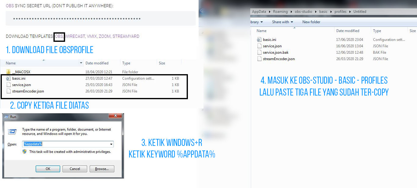 5. Kamu harus terlebih dahulu menginstall obsprofile dengan menekan tombol OBS lalu download obsprofile. Kemudian copy ketiga files tersebut ke dalam file obs – studio dengan menekan tombol windows+R lalu ketik %appdata%