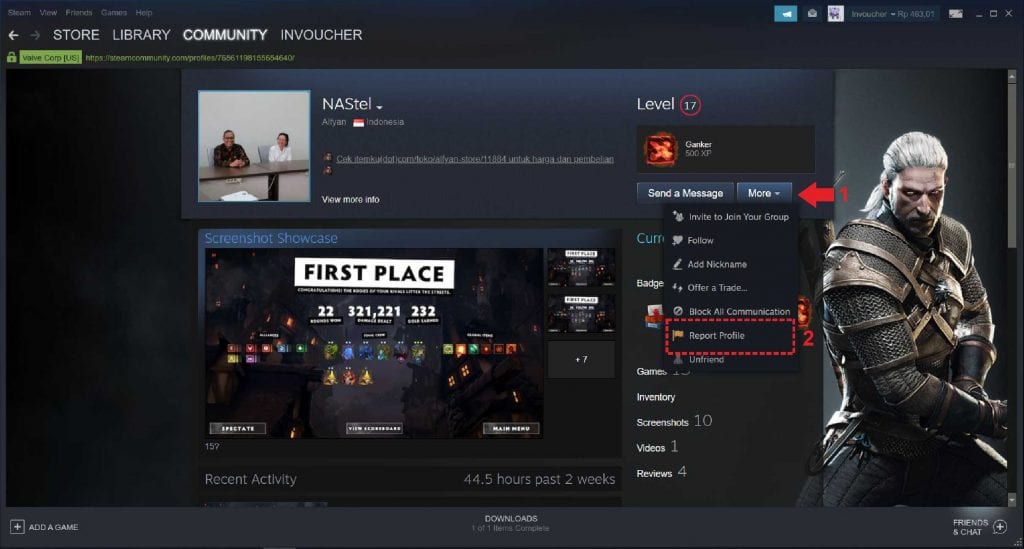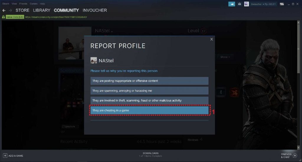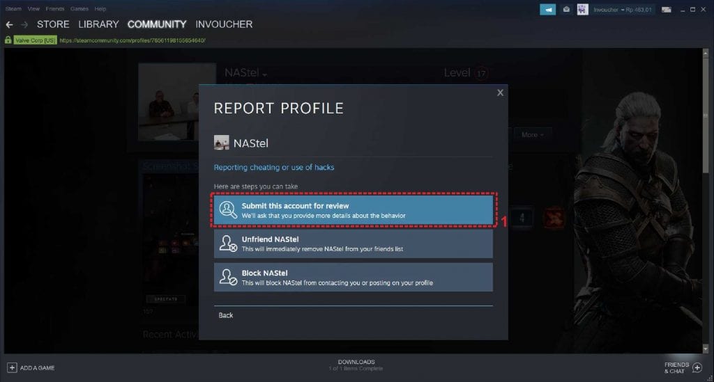 Steam dalam sistemnya telah memberikan fitur yang disebut report account. Fungsi dari fitur ini adalah untuk melaporkan akun-akun penggguna yang terindikasi melakukan kecurangan. Kali ini penulis akan memberikan tutorial tentang cara melaporkan kecurangan akun pengguna di aplikasi steam. Adapun langkah-langkahnya sebagai berikut: