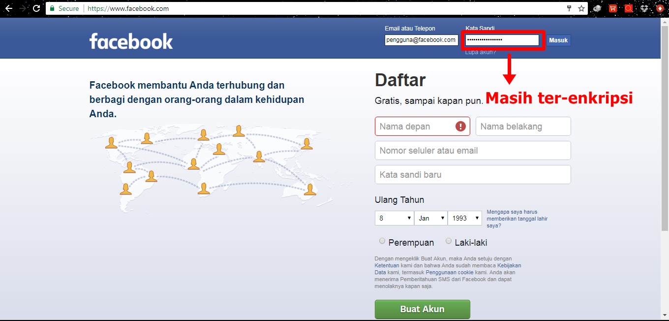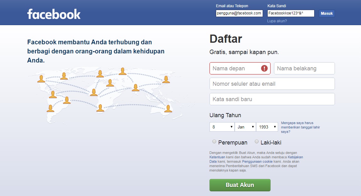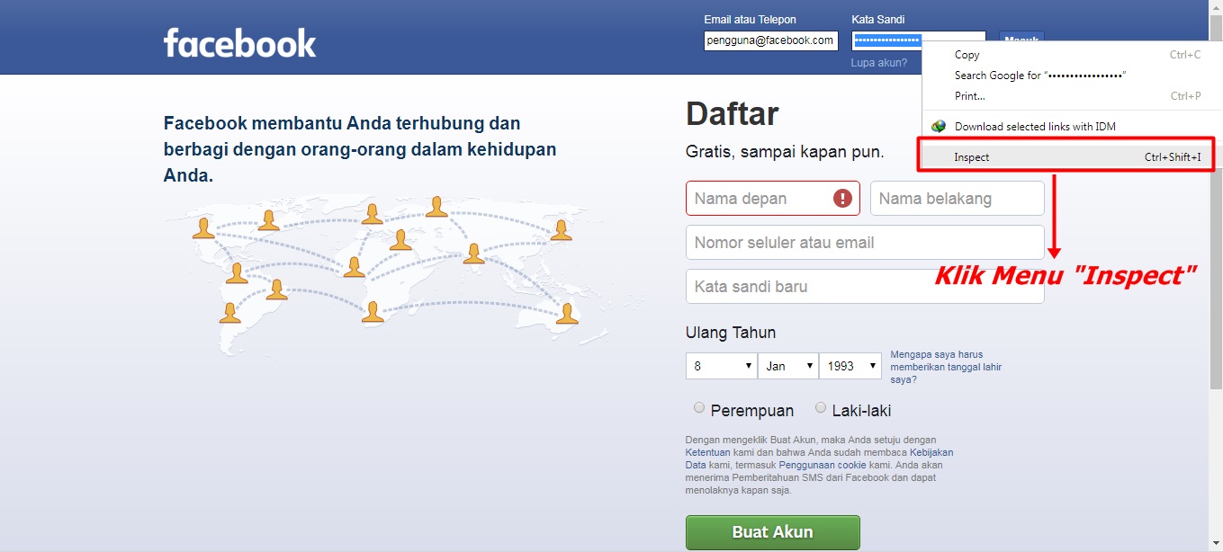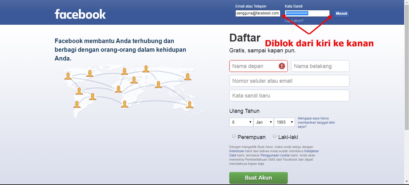 1. Bukalah sebuah situs yang membutuhkan login untuk masuk, kita akan contohkan pada halaman masuk situs Facebook.