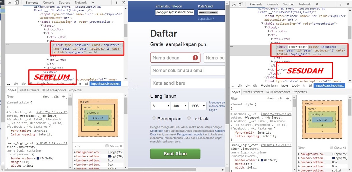 Jika sudah ketemu, maka ganti tulisan password tersebut dengan tulisan “text” tanpa tanda ketik. Maka kodenya akan berubah menjadi <input type=”text” class=”inputtext” name=”pass” id=”pass” tabindex=”2″ data-testid=”royal_pass”>