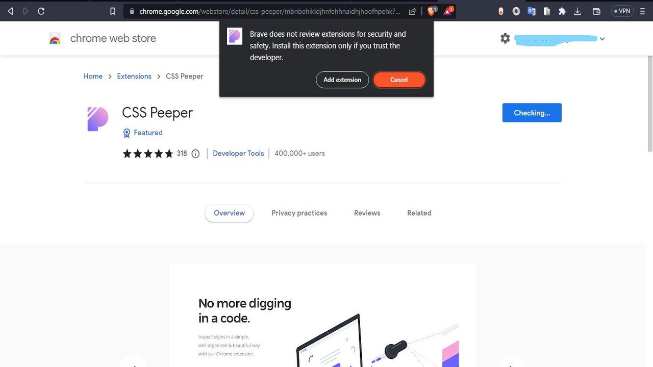4. Pada pencarian mengenai search the store, ketik aja css peeper maka akan muncul seperti ini :