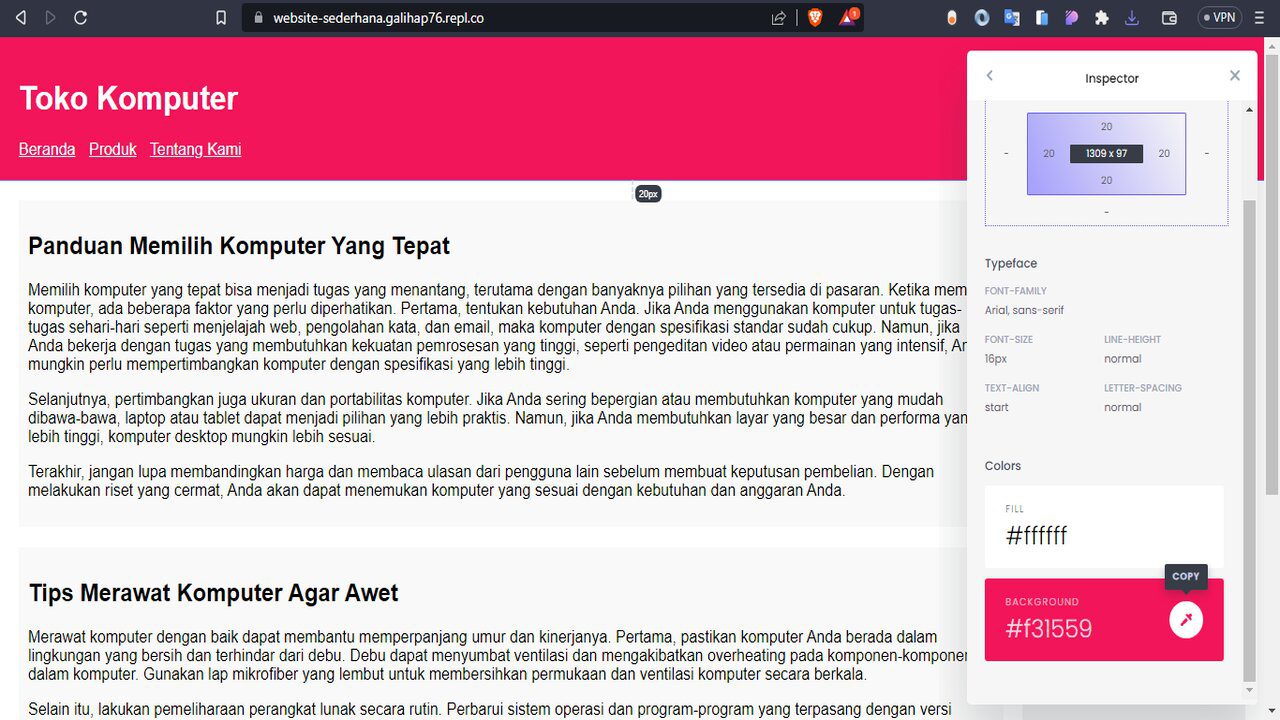 Ok, bagaimana cara menggunakan nya? katakanlah penulis mengunjungi sebuah situs di mana situs ini adalah situs milik penulis yang telah di hosting di replit, kamu bisa cari sendiri situs nya untuk mencoba ekstensi ini. Untuk itu penulis cukup klik pada ekstensi css peeper nya pada atas kanan browser dan pilih area warna situs yang ingin di lihat lalu klik.