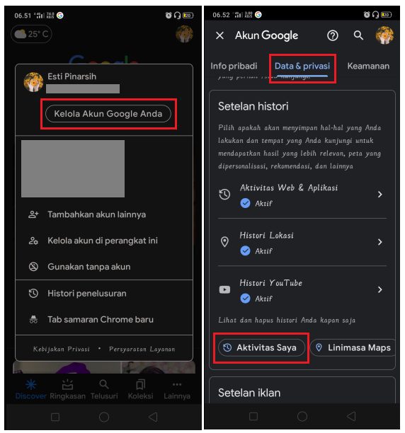 2. Pada halaman Akun Google, pilih folder Data & Privasi dan kemudian pilih menu Aktifitas Saya.