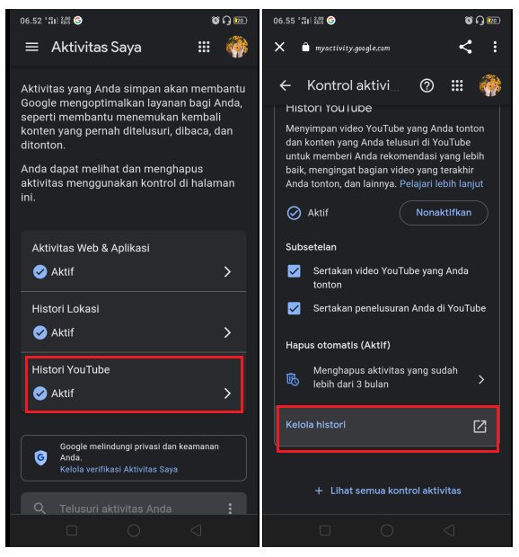 3. Karena kita ingin menampilkan semua komentar kita di akun YouTube, pilih menu Histori YouTube. Kemudian cari dan pilih link Kelola histori.