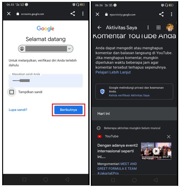 6. Ketikkan password akun Google kamu dan kemudian tekan tombol Berikutnya. Selesai, kini aplikasi Google akan menampilkan semua komentar kamu di aplikasi YouTube.