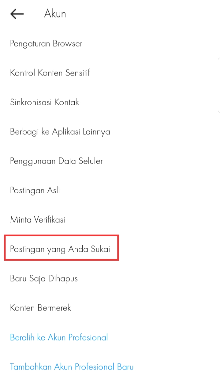 4. Di barisan paling bawah terdapat menu “Postingan yang Anda Sukai”. pilih menu tersebut untuk melihat riwayat postingan Instagram yang pernah kamu sukai.