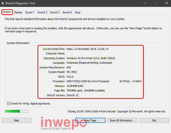 DxDiag juga menampilkan informasi tentang spesifikasi secara ringkas tentang semua komponen Hardware (perangkat keras komputer) dan Driver (software-software atau perangkat lunak yang menjadi penghubung alat pelengkap komputer) yang terinstall pada perangkat komputer. DirectX Diagnostic Tools juga merupakan suite teknologi yang digunakan oleh banyak program multimedia di Windows. Lalu bagaimana cara melihat spesifikasi Laptop / PC Windows 10? simak tutorial berikut.