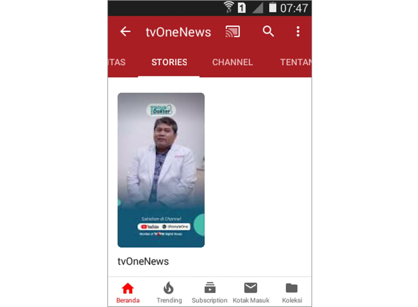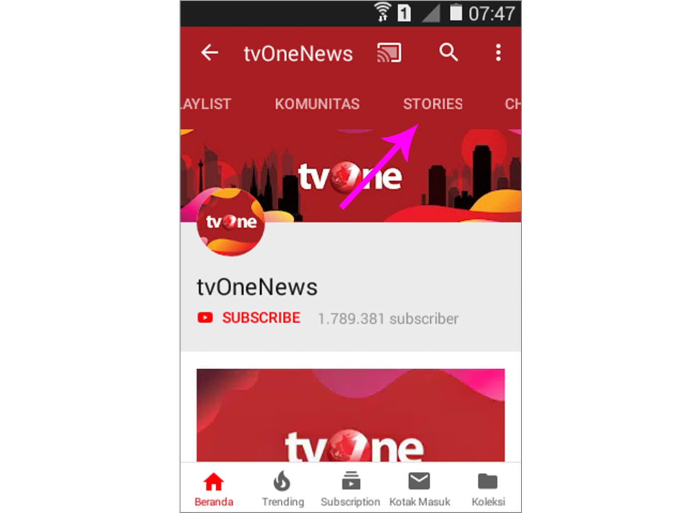 4. Ketika sudah masuk di beranda channel, silakan geser ke kiri dan pilih stories.