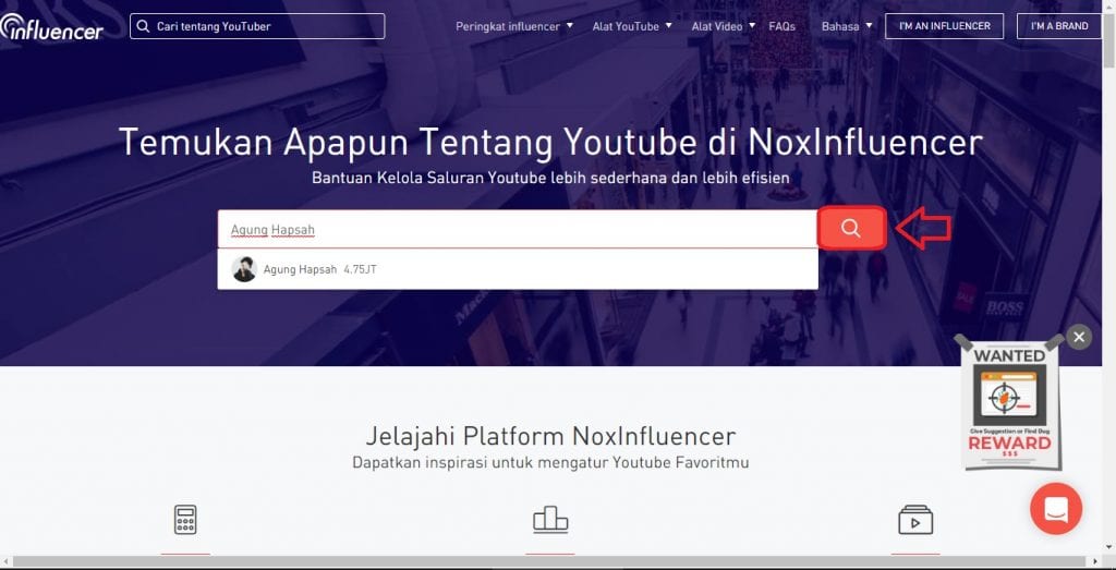 2. Lalu buka situs NoxInfluencer.com dan ketik nama channelnya pada menu search, dan klik enter.