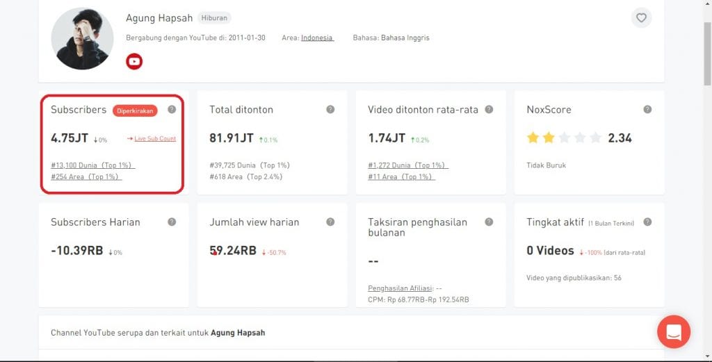 Bagaimana mudah bukan cara mengetahui subscriber channel Youtube yang disembunyikan? Selain itu, website NoxInfluencer juga memungkinkan kamu untuk mengetahui pendapatan dari Youtuber dan statistik lainnya, seperti jumlah tontonan, video dan lainnya. Apalagi statistik yang dihadirkan dilengkapi dengan presentase kenaikan dan penurunan.