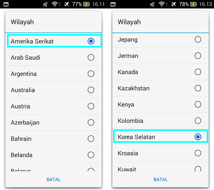6. Setelah itu akan tampil nama wilayah. Cari dan tekan negara yang diinginkan, contoh Amerika atau Korea.