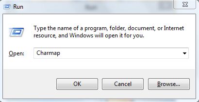 1. Pertama kamu harus membuka Run dengan menekan tombol windows+R, lalu ketik CHARMAP kemudian klik OK.