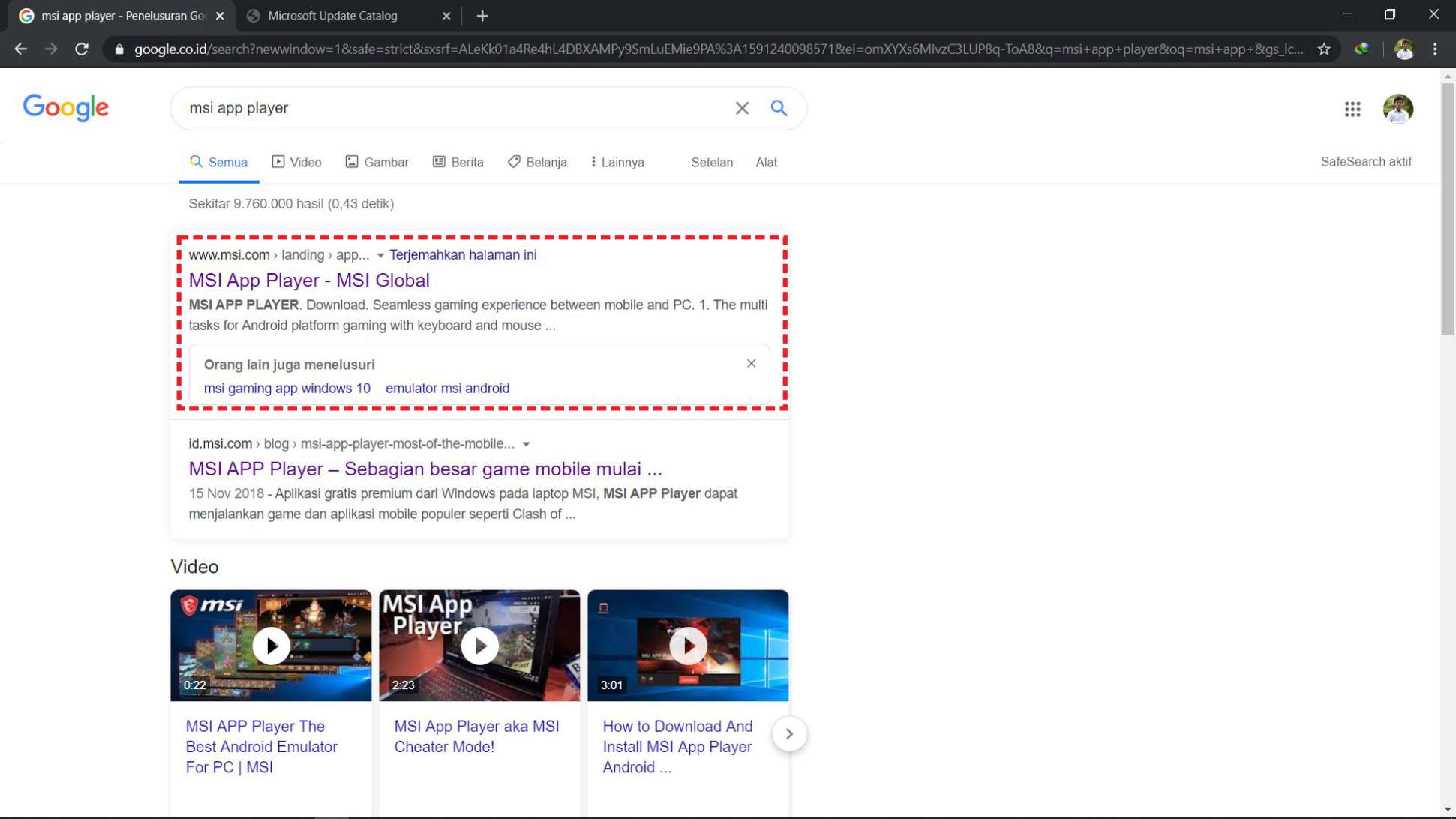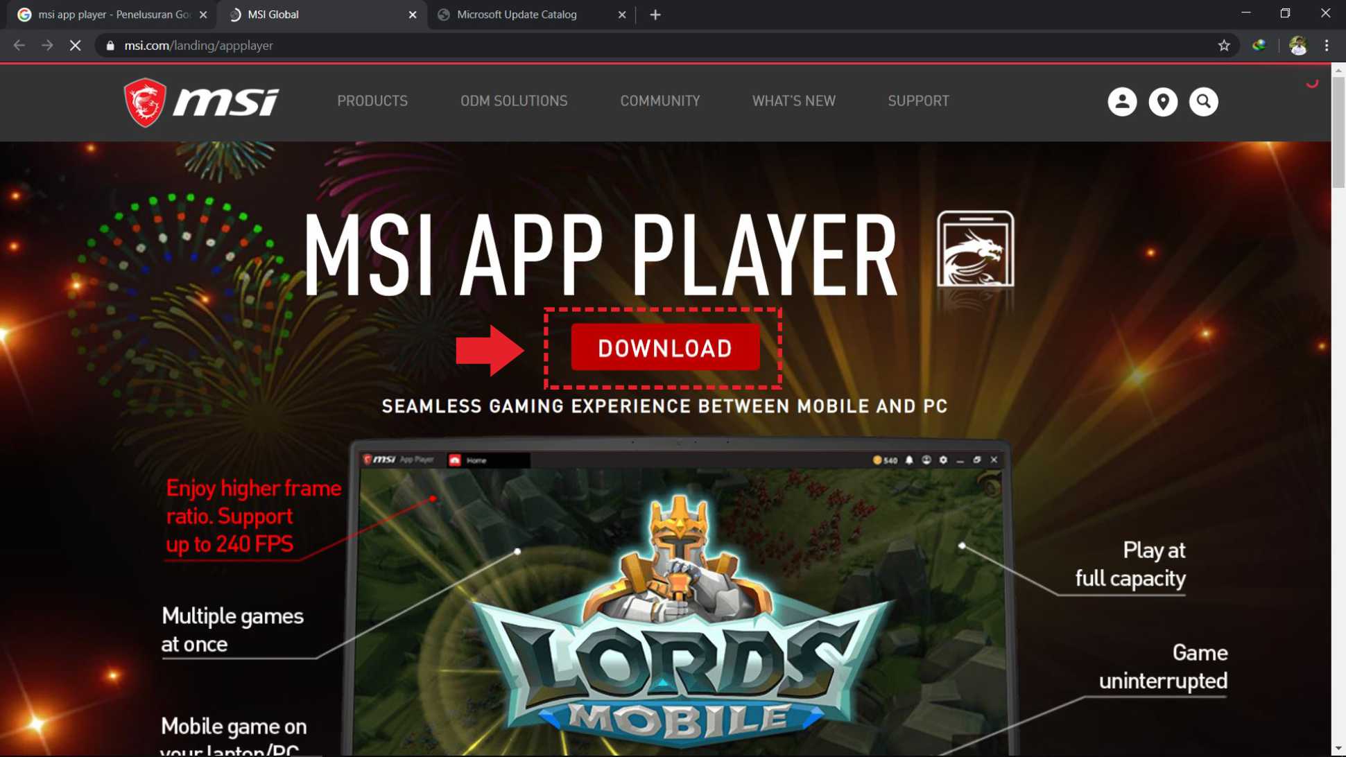 1. Langkah pertama, buka website www.msi.com atau ketikkan “msi app player” pada mesin pencarian google. Jika sudah klik alamat web seperti pada kotak warna merah di gambar.