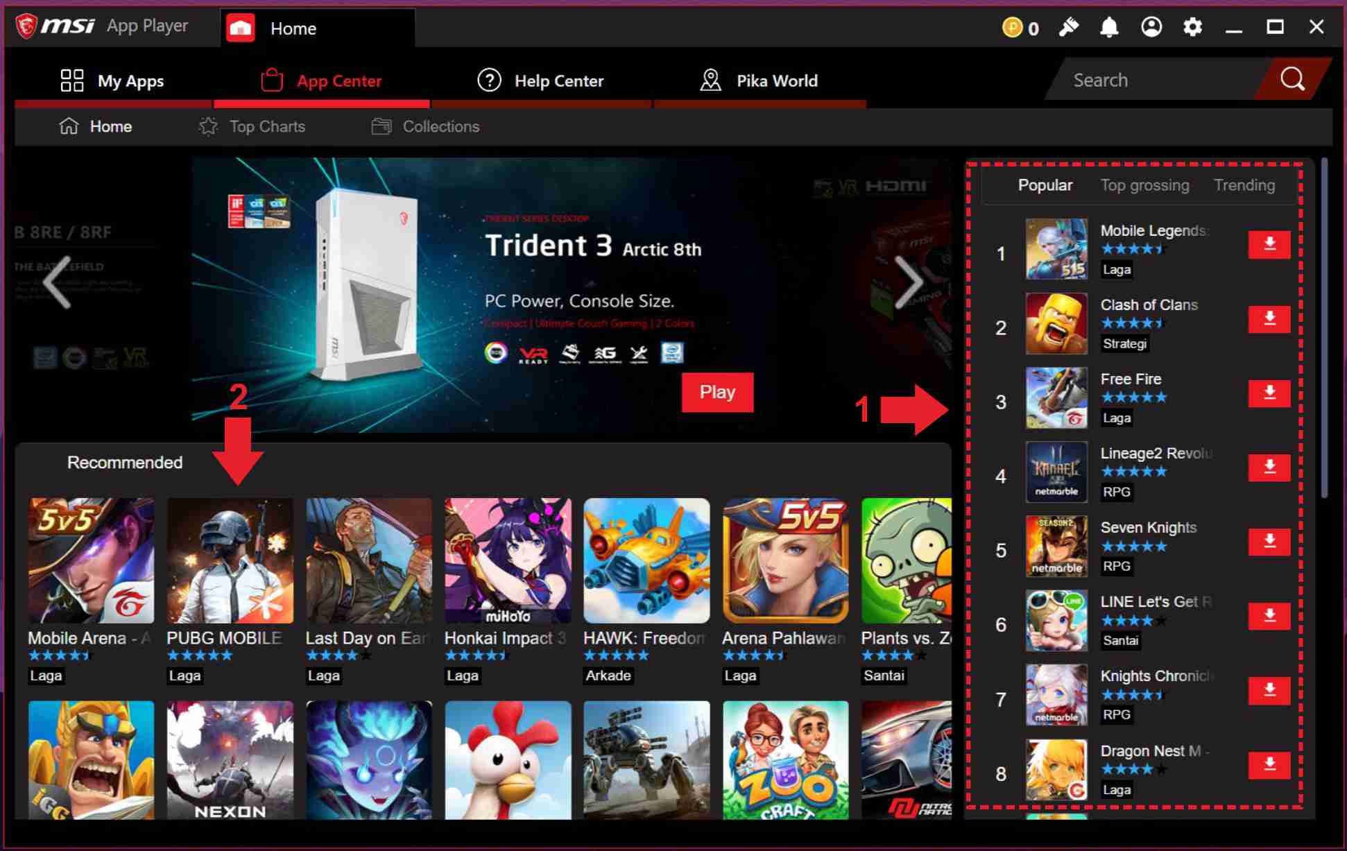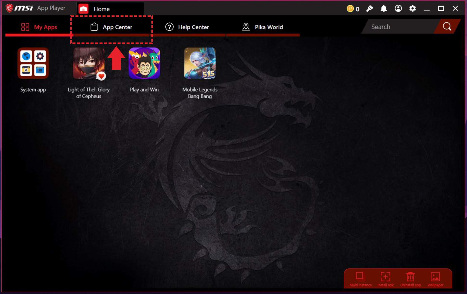 3. Tunggu proses unduhan hingga selesai. Langkah selanjutnya install aplikasi tersebut. Adapun halaman menu dari aplikasi msi app player dapat dilihat pada gambar berikut. Klik menu app center.