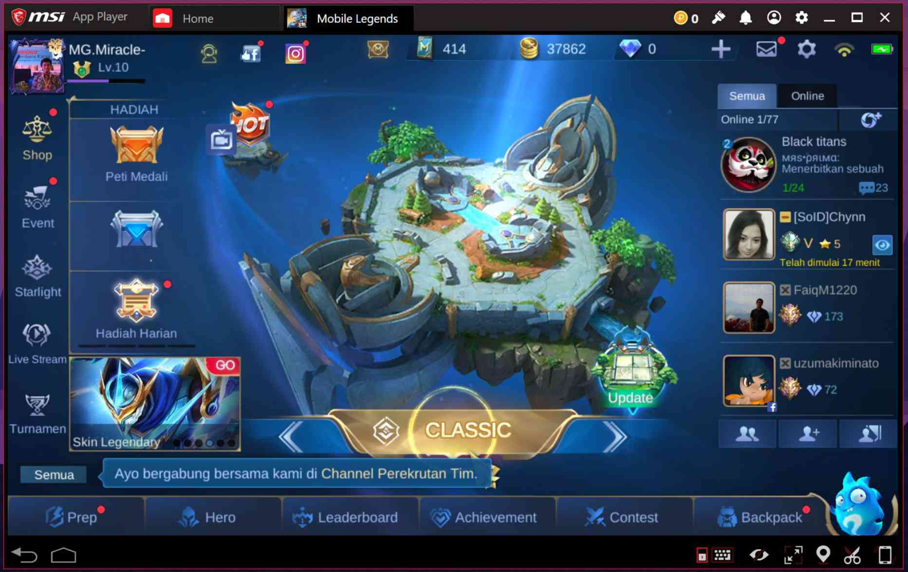 6. Dikarenakan aplikasi PUBG Mobile sedang dalam unduhan, disini penulis akan menunjukkan contoh tampilan in-game dari aplikasi game Mobile Legends yang menggunakan aplikasi MSI App Player. Adapun hasilnya dapat dilihat pada gambar berikut.