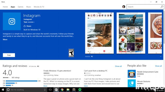 1. Buka Windows Store di PC Anda, kemudian search Instgram. Tekan tombol Free untuk mulai men-download aplikasi tersebut. Penulis juga telah memberikan link download di akhir artikel ini.