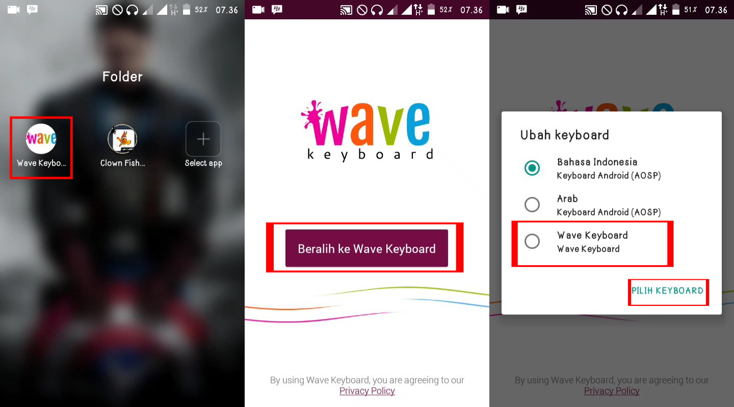 3. Jika keduanya sudah terpasang, selanjutnya buka aplikasi Wave Keyboard, pilih beralih ke Wave Keyboard dan jadikan aplikasi default.