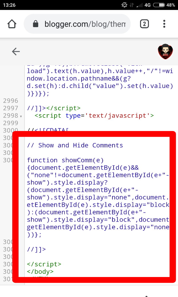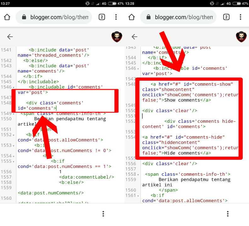 4. Cari dan temukan Markup Kode yang serupa seperti ini <div class=’comments’ id=’comments’>. Biasanya terdapat dua kode, kamu ganti keduanya dengan kode pemanggil di bawah ini.