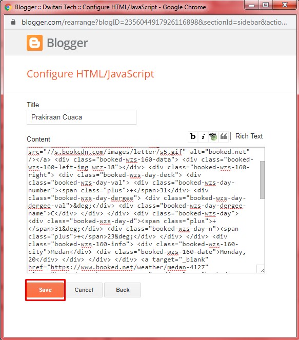 9. Pastekan source code widget prakiraan cuaca yang tadi. Kemudian, klik Save.