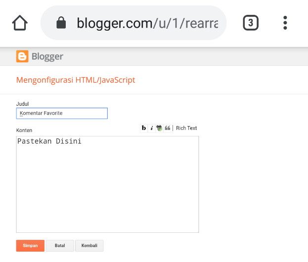 4. Selanjutnya kamu pilih menu Tata Letak – Tambahkan Gagdet – HTML/Javascript – Pastekan kode pemanggil di bawah ini.