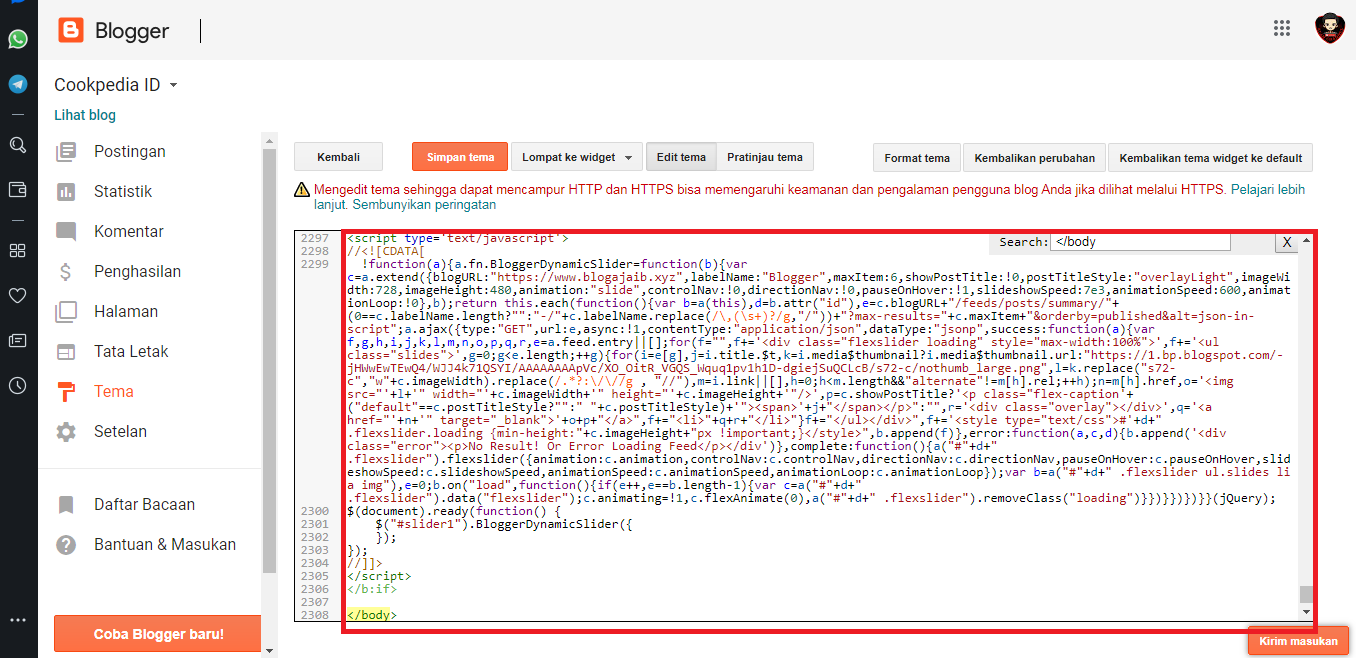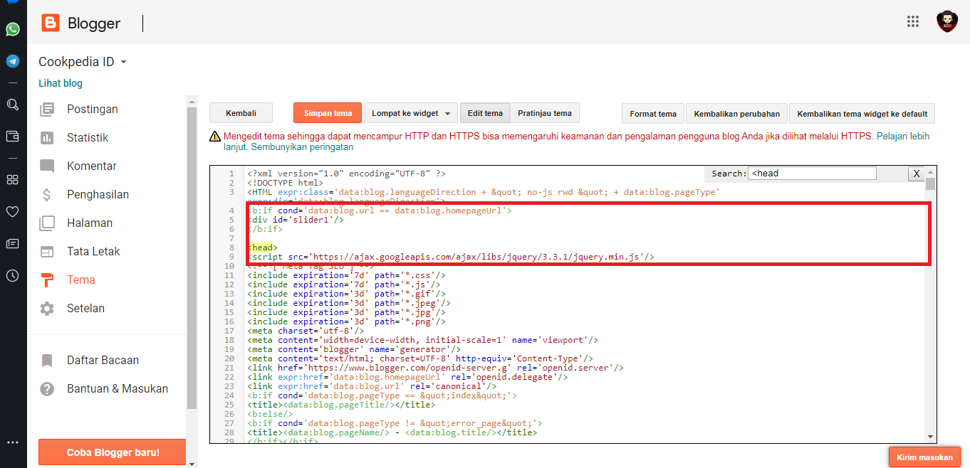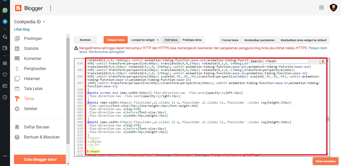 4. Masukan kode pemanggil di bawah ini. Untuk posisinya bebas bisa sesuai selera kamu. Contoh, disini penulis akan meletakannya sebelum kode <head> yang nanti posisinya di atas postingan blog.