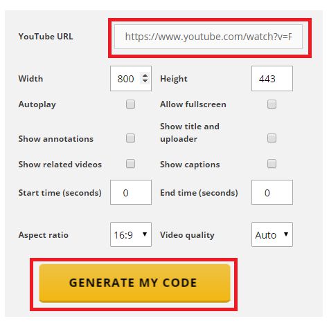 4. Lalu kamu masukkan url video Youtubenya dan kamu klik pada tombol generate my code.