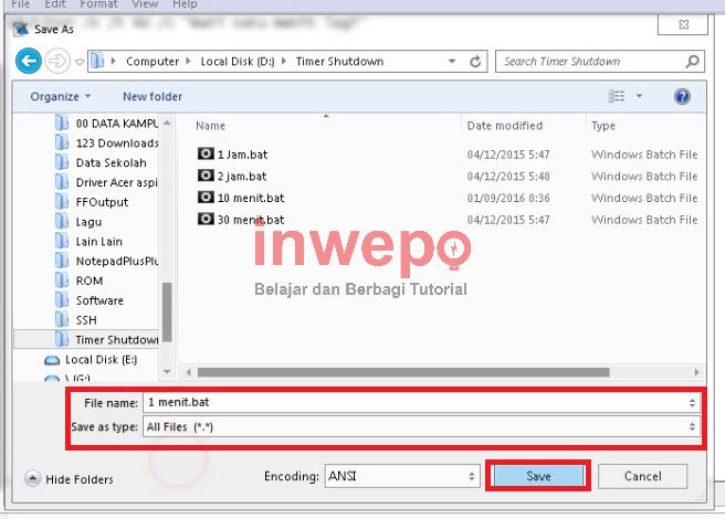 3. Lalu kamu klik file – save, kamu ubah pada bagian save in type menjadi All Files dan kamu masukkan pada kolom filename menjadi sleep.bat (kamu bebas memberikan nama apapun, yang penting diakhirnya diberikan teks .bat tanpa spasi) lalu klik save.