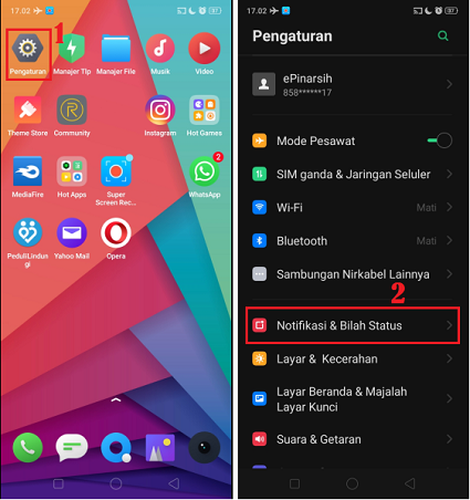 1. Buka menu ‘Setting / Pengaturan’ di HP Realme kamu. Cari dan klik ikon panah samping pada menu ‘Notifikasi & Bilah Status’.