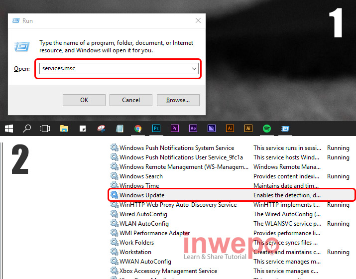 2. Ketik Services.msc – Klik Ok – Scroll ke bawah, klik Windows Update.
