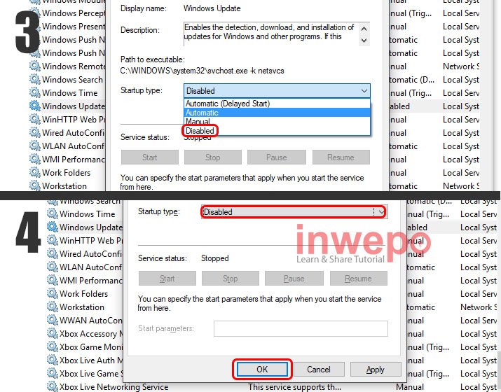3. Pada menu Startup Type – Pilih Disabled – Klik Ok.
