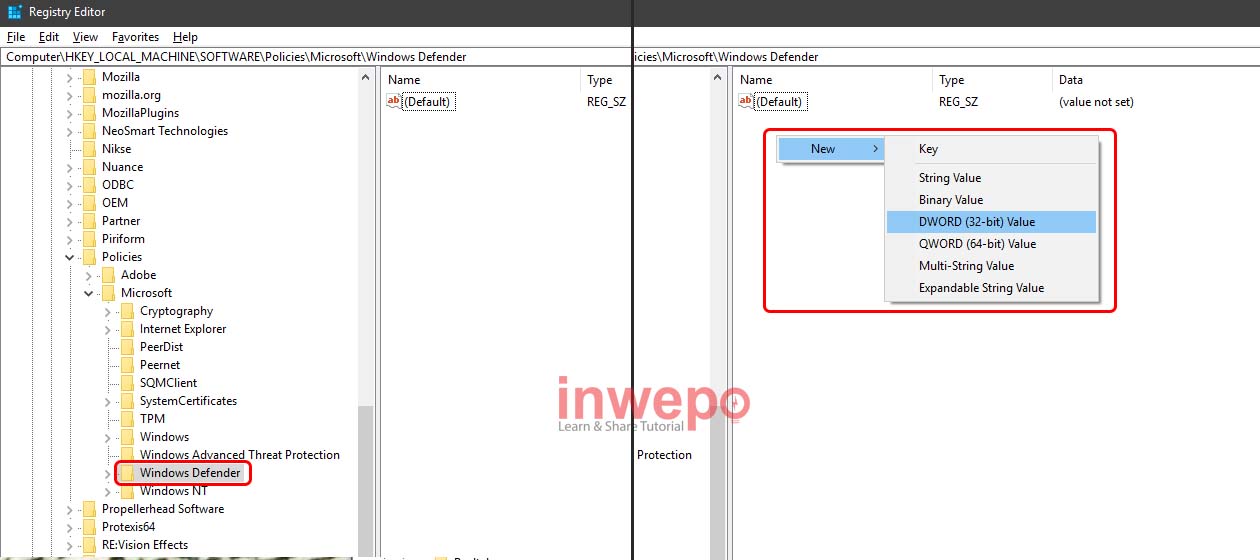 3. Pergi ke HKEY_LOCAL_MACHINE SOFTWARE Policies Microsoft Windows Defender – Klik kanan pada panel sebelah kanan – arahkan kursor ke New – klik DWORD 32-bit Value.