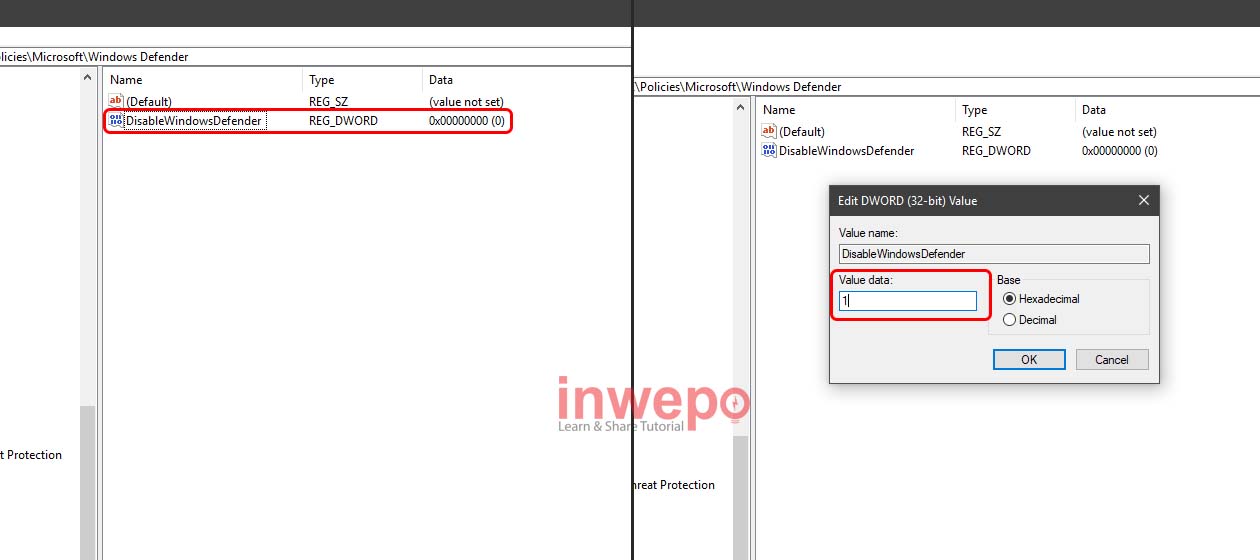 4. Beri nama “DisableWindowsDefender” lalu tekan Enter – Klik dua kali pada “DisableWindowsDefender” – Ganti Value dari 0 ke 1.
